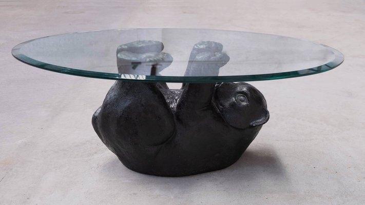The base of the table is shaped like a bear laying on its back with its paws in the air to support the oval glass table top.