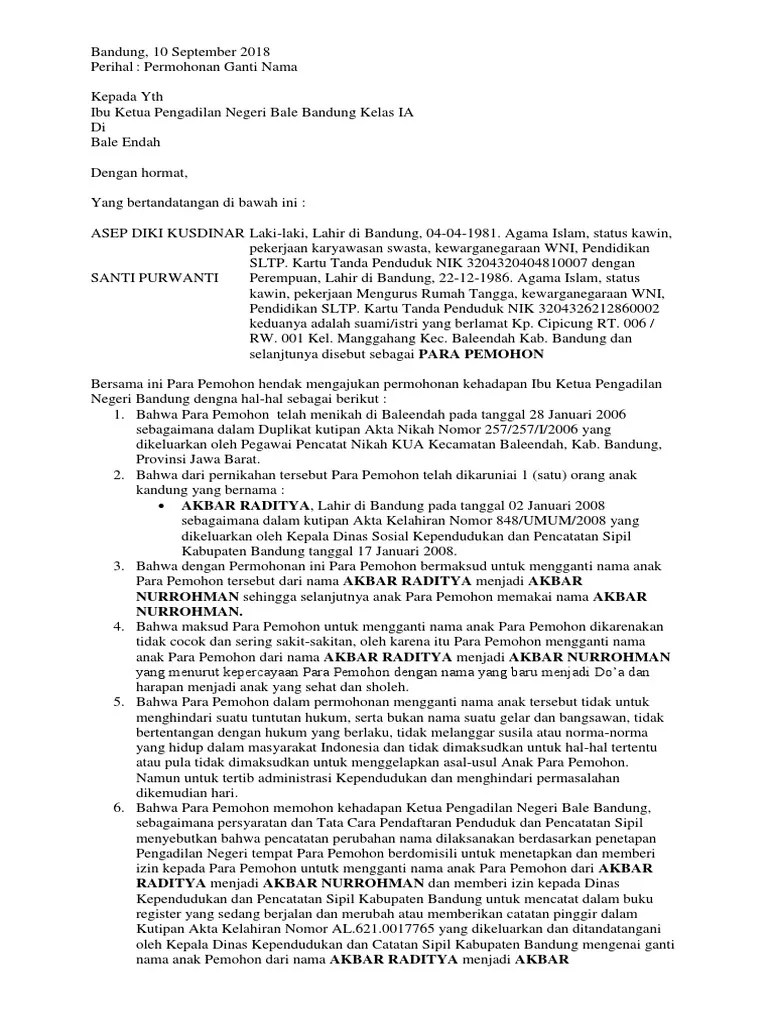 Surat Permohonan Ganti Nama Pengadilan / 6 Contoh Surat Permohonan Ganti Nama Atau Pebaikan Lezgetreal : Surat kuasa perubahan nama akta kelahiran;. Setiap nama yang diberikan oleh orang tua pada anaknya, pasti di dalamnya mengandung harapan dan juga doa untuk masa depan anaknya. 31/10/2017 · contoh surat permohonan ganti nama di pengadilan. Contoh surat permohonan ganti nama pengadilan negeri revisi download contoh surat permohonan ganti nama pengadilan negeri revisi download format surat lain: Bahwa proses mengganti nama di kantor duk capil harus adanya penetapan dari pengadilan, sehingga masyarakat harus mengajukan surat permohonan dan membawa saksi minimal 2 orang ke pengadilan yang akan menguatkan alasan permohonan tersebut. Surat kuasa perubahan nama akta kelahiran;